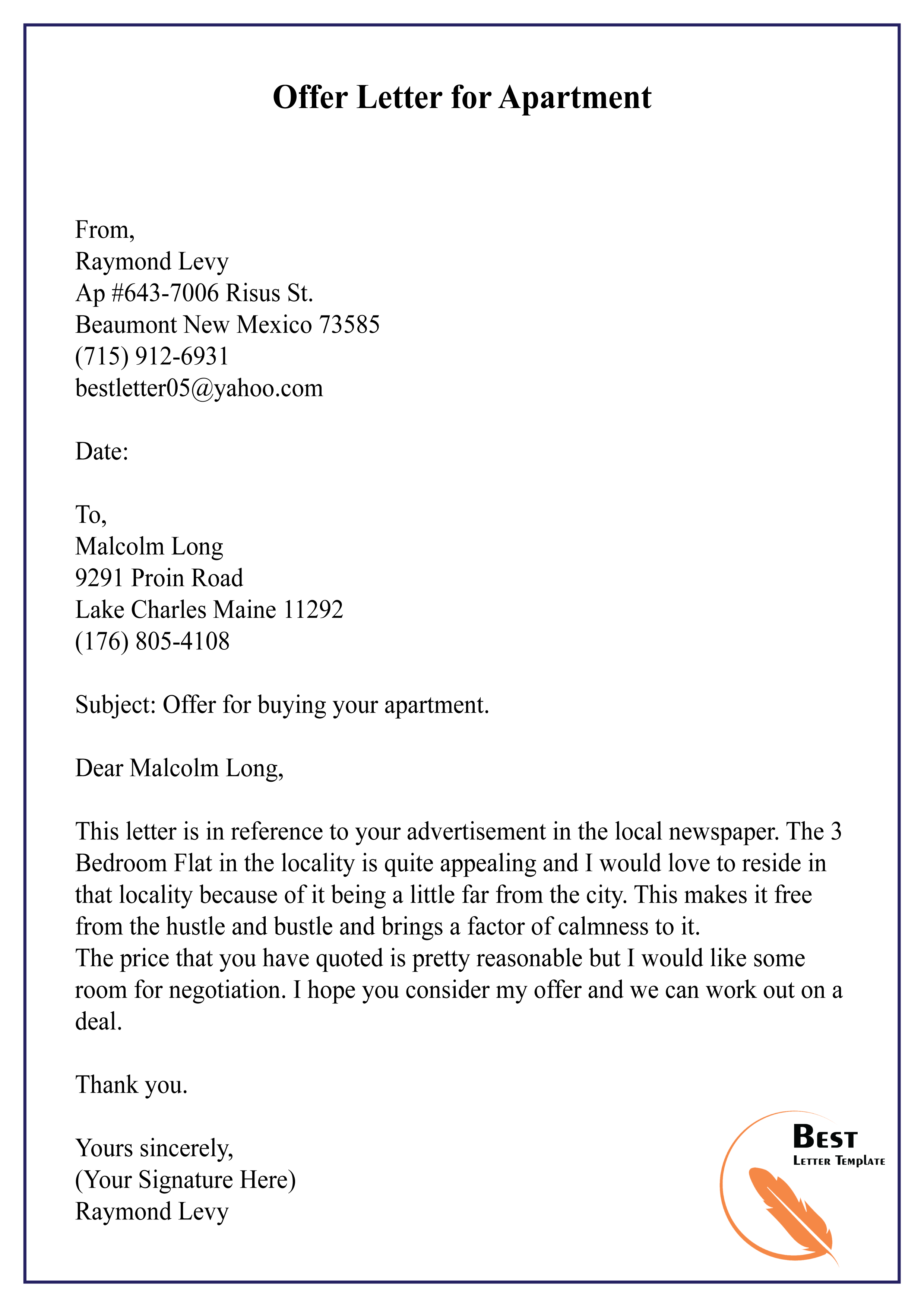 Offer letter template for apartment rental – Artofit